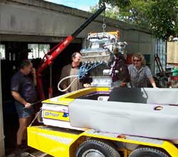 The boat is a 18'6" fiberglass, Everingham (a well known Australian boat builder) ski race hull. Two long-range fuel tanks, all up holds about 260 litres, the hull weighs with engine around 1200 - 1400 pound.